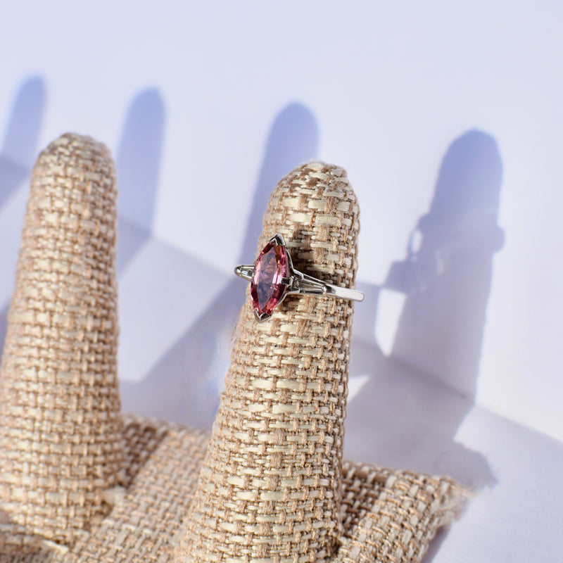 A rare find with timeless allure, this vintage platinum ring centers on a moody marquise-cut pink tourmaline—its hue shifting softly between rose and deep blush depending on the light. Two slender diamond baguettes flank the center stone, adding quiet brilliance and balance to the composition.