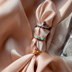 Three stone ring featuring two opals, and one diamond set in gold- a delicate, fire filled ring to adorn your hand.