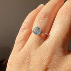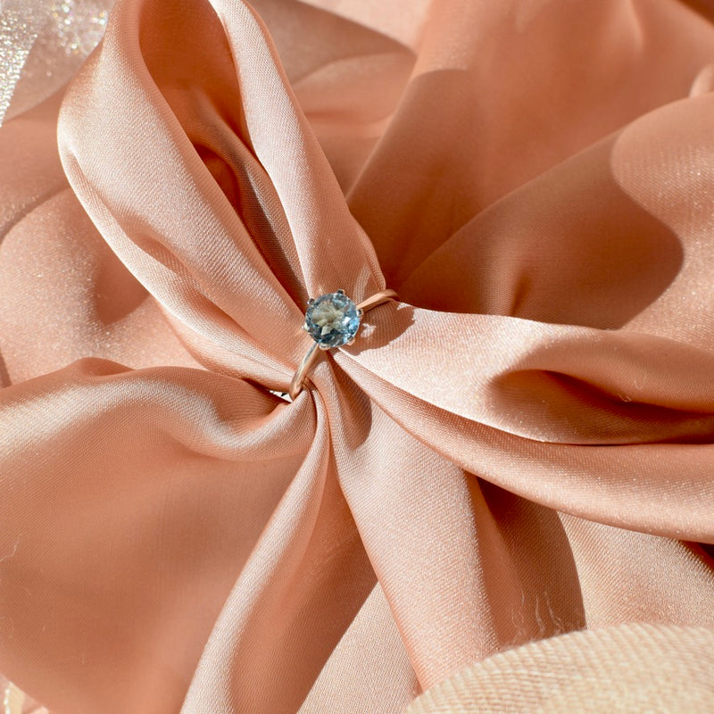 Elevate your everyday with this radiant blue topaz solitaire ring. The round-cut blue topaz catches the light with a crisp, watery sparkle—calm, bright, and unmistakably elegant. It’s set in a classic four-prong sterling silver setting that keeps the focus on the stone’s natural brilliance.