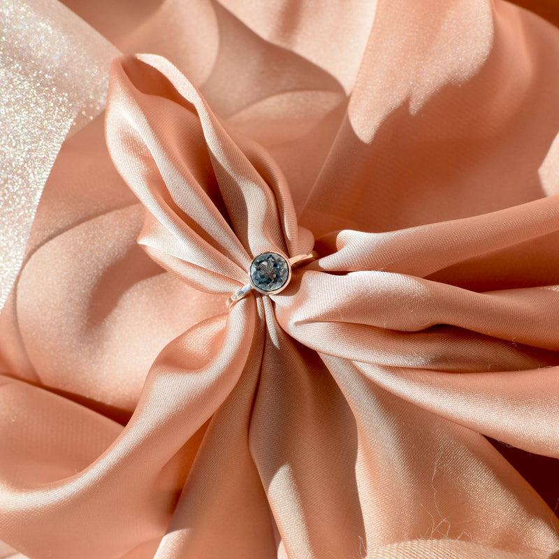 Cool and luminous, this round blue topaz glows with the tranquil hue of a clear winter sky. The stone’s faceted surface catches the light with every movement, while its sterling silver bezel setting offers a sleek frame that enhances the gem’s natural brilliance.