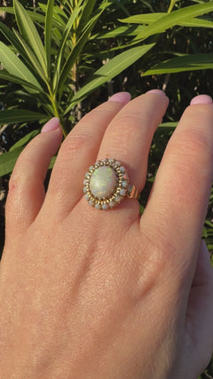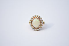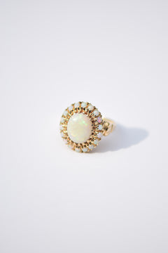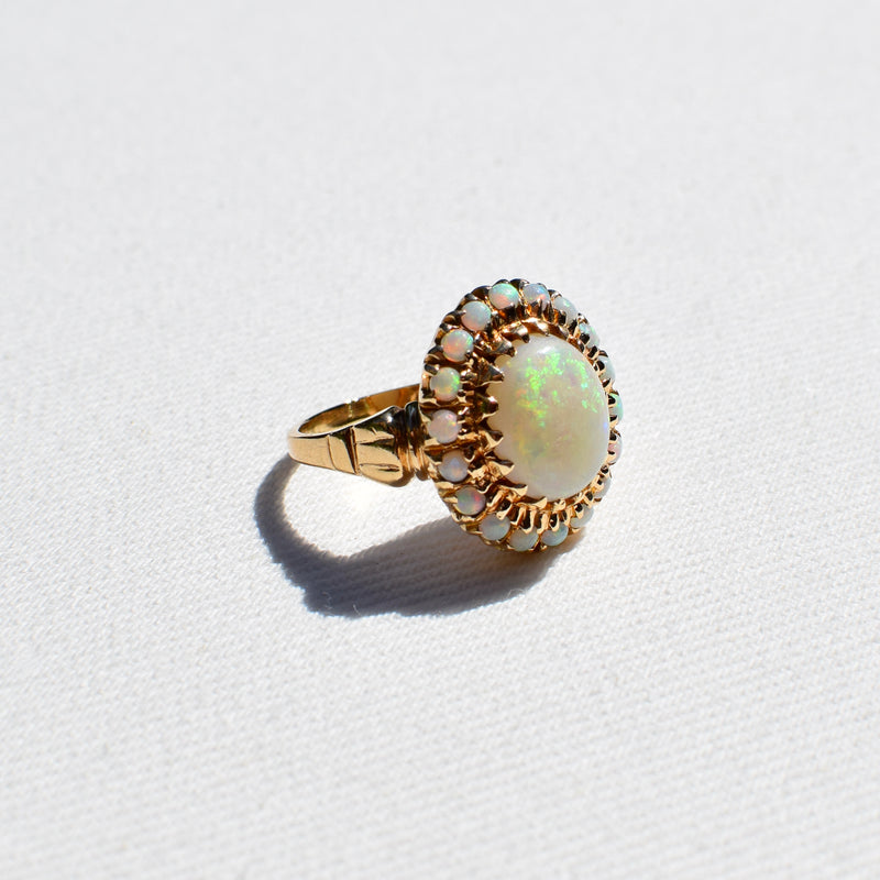 Magnificent Opal cabochon ring surrounded by a halo of opals set in 10k yellow gold