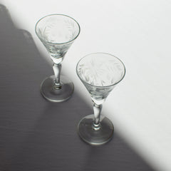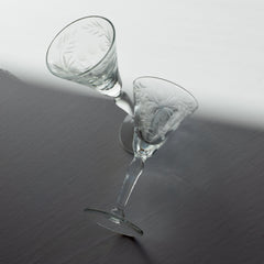 Delicate and luminous, this pair of vintage etched glasses brings an old-world grace to the table. Each 4.5-inch stemmed glass features hand-cut floral motifs that catch the light beautifully, casting intricate reflections with every pour. Perfect for aperitifs, cordials, or dessert wines, their size and craftsmanship make them as functional as they are collectible.