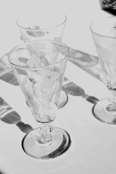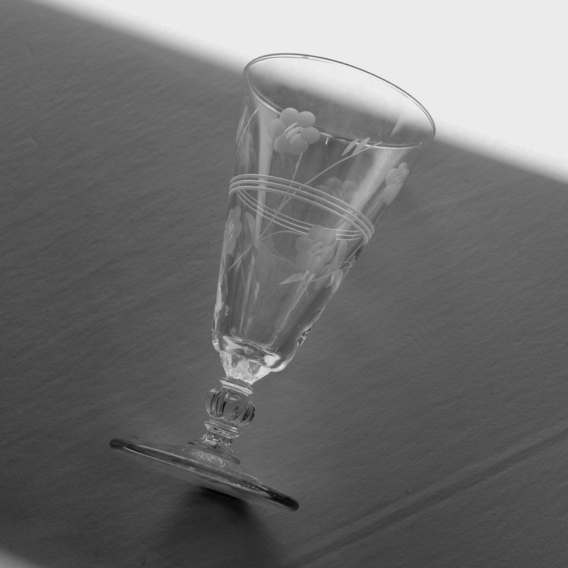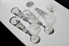 Refined and romantic, this set of four vintage etched glasses brings timeless beauty to any occasion. Each glass features a graceful floral etching with delicate linework circling the bowl, complemented by an elegant faceted stem that adds a touch of old-world sophistication.