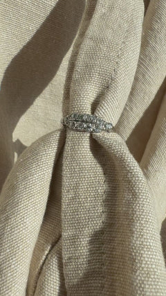 A whisper of light that feels both antique and effortlessly modern. This vintage diamond band features a row of bright, prismatic stones set in sculpted white gold, forming a soft crescent of shimmer across the finger. Each diamond is framed by delicate metalwork—tiny curves, milgrain-like edges, and subtle hand-cut details that speak to an earlier era of craftsmanship.